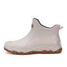 This men’s ankle boots have an ankle-height shaft with a rear pull tab. The upper has curved overlay seams and a closed round toe with a bumper cap. They are slip-on with no visible closure and sit on a treaded outsole with angled grooves.