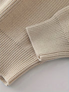 This men’s sweater has a stand collar with a short front zipper. The body and sleeves have a vertical ribbed texture. It has long sleeves with ribbed cuffs and a ribbed hem.