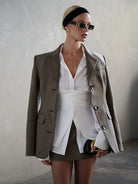 - Hem: Front slits with layered panels.
