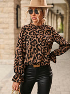 This women’s blouse has a ruffled mock neck and an all-over leopard print. It has long sleeves with ruffled elastic cuffs. The hem is curve.