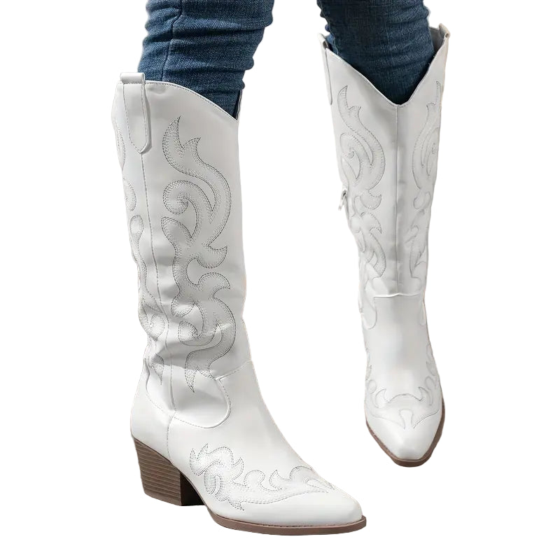 These women’s boots have a knee-high shaft with curved top edges, pull tabs at the sides, and a pointed toe. The shaft has stitched designs on the front and sides. They have a stacked block heel and a side zipper closure that extends to the midsection of the shaft.