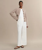 This women’s cardigan has a ribbed crew neck and a front button placket with round buttons. Two welt pockets are on the front near the waist. It has long sleeves with wide ribbed cuffs and a straight ribbed hem.