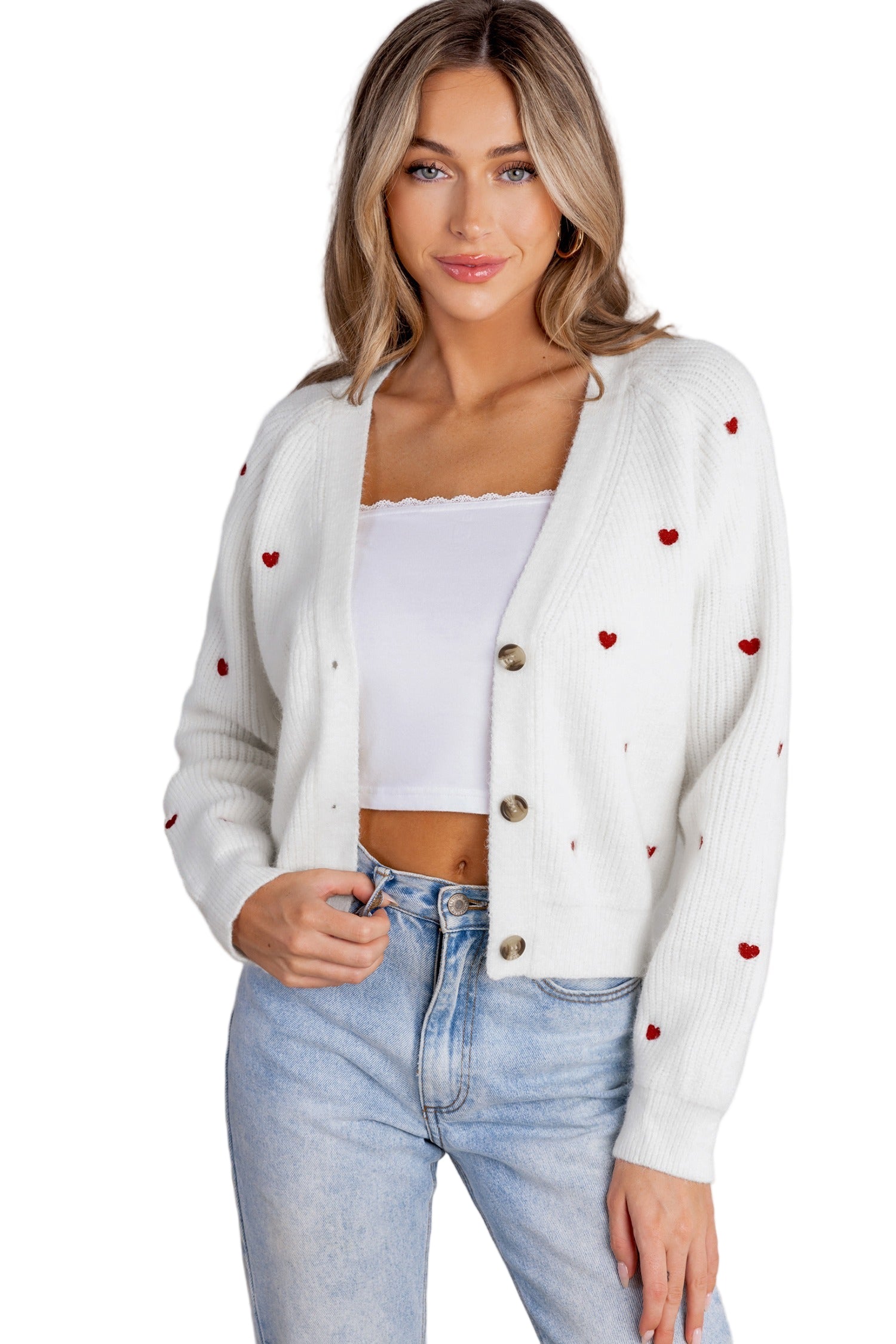 Women’s Long Sleeve Cardigan with V-Neckline and Heart Motifs