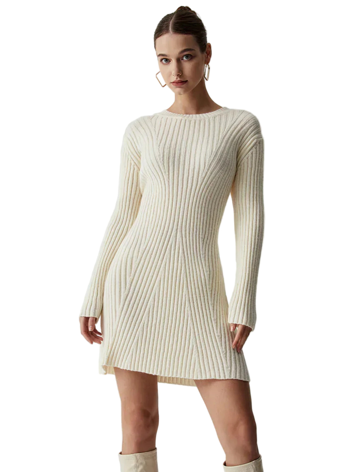 Women’s Long Sleeves Mini Sweater Dress with Round Neckline and Ribbed Knit Pattern