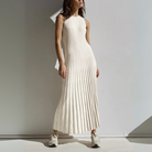 This women’s maxi dress has a sleeveless construction with extended material across the shoulder area. The neckline is round and positioned near the top of the garment. Evenly spaced vertical pleats run from the neckline down to the hem. The hemline is full-length with a straight edge.