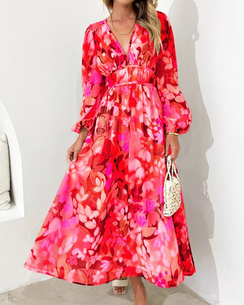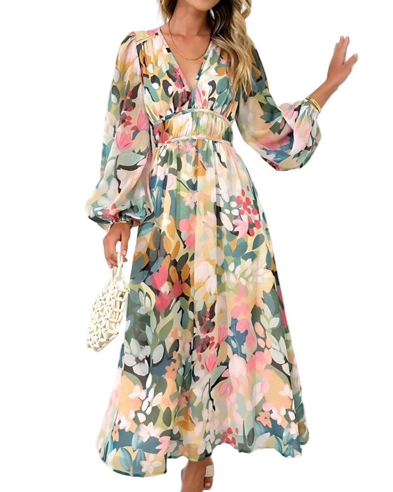 Women’s V-Neck Midi Dress with Puff Sleeves and Floral Print