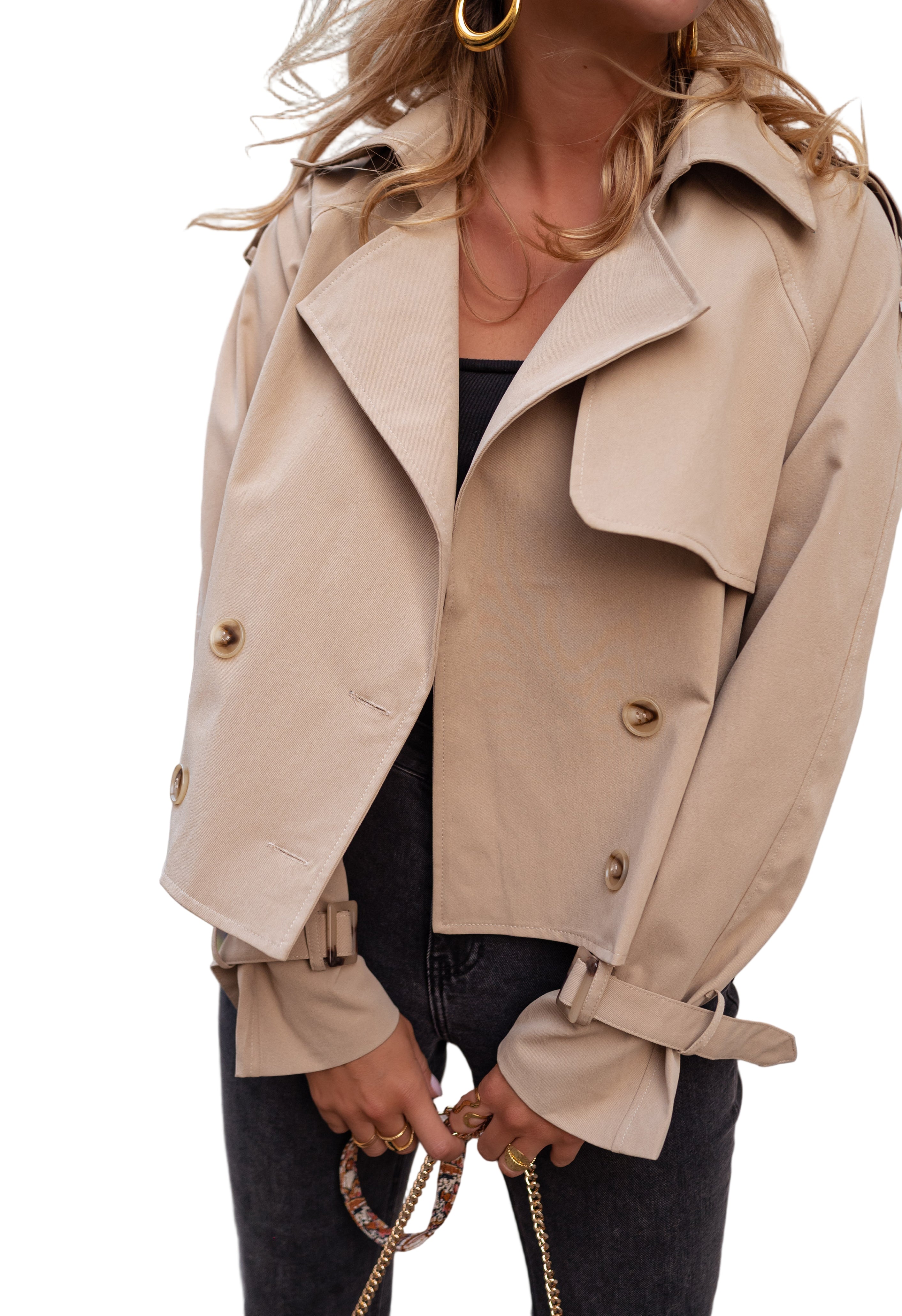 Women’s Cropped Trench Coat with Notched Lapel and Sleeve Straps