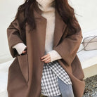 This women’s coat has an open front with a wide notched lapel collar. Two rectangular patch pockets are positioned on the lower front. The sleeves are long and wide.