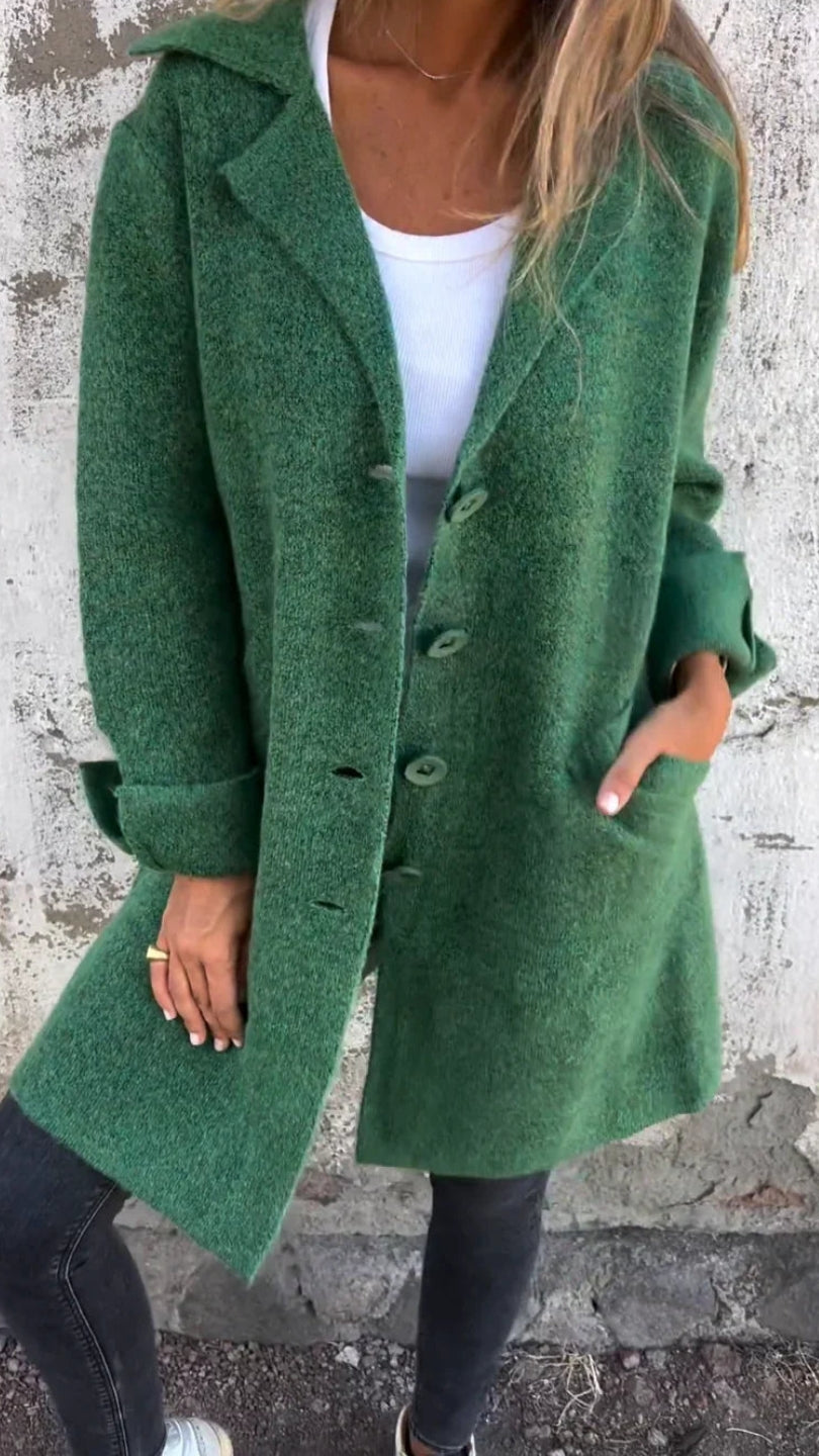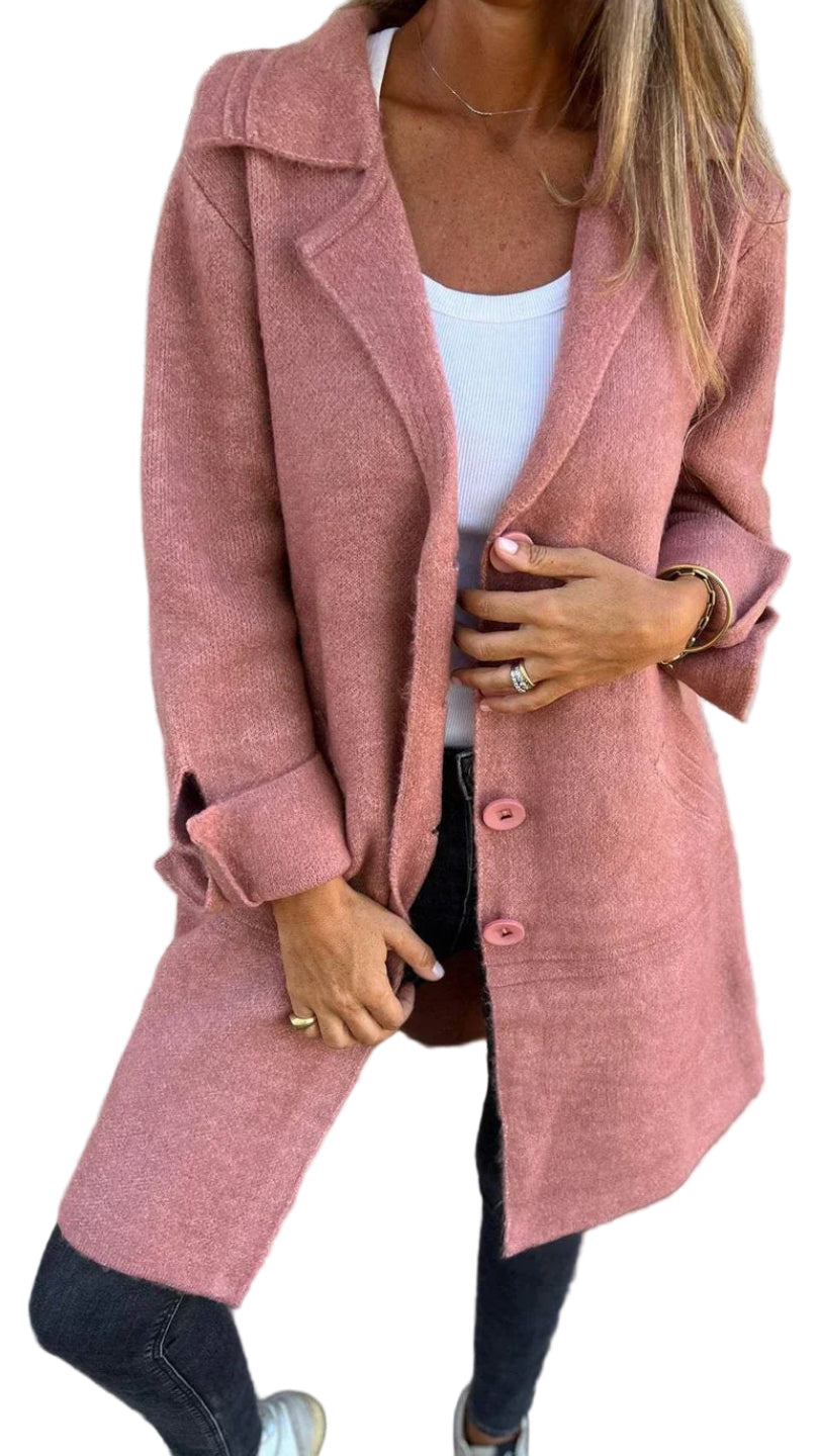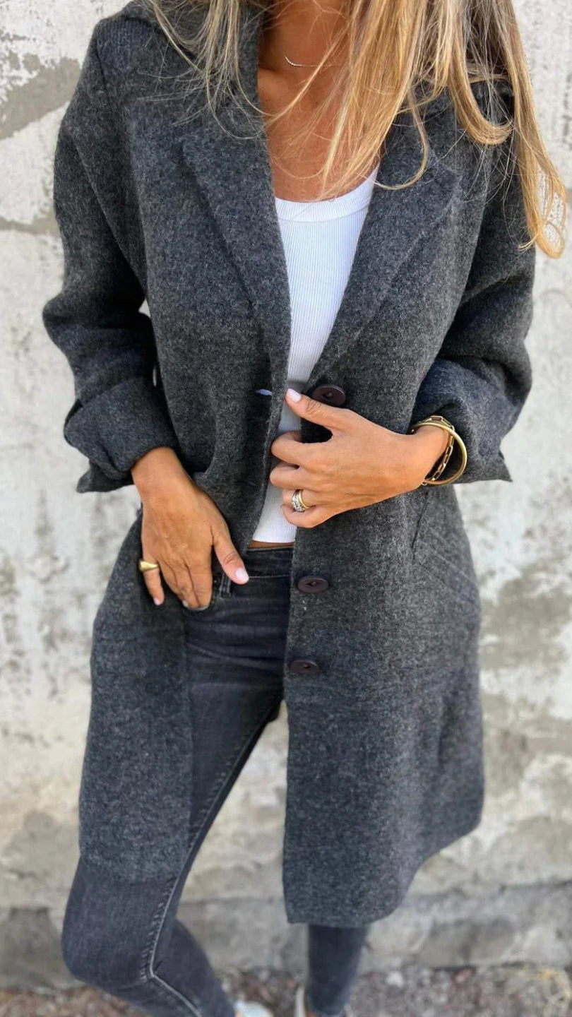 This woman’s coat has a single-row button front with a wide notched lapel collar. The long sleeves end with cuffs. Two open side pockets are positioned at hip level.
