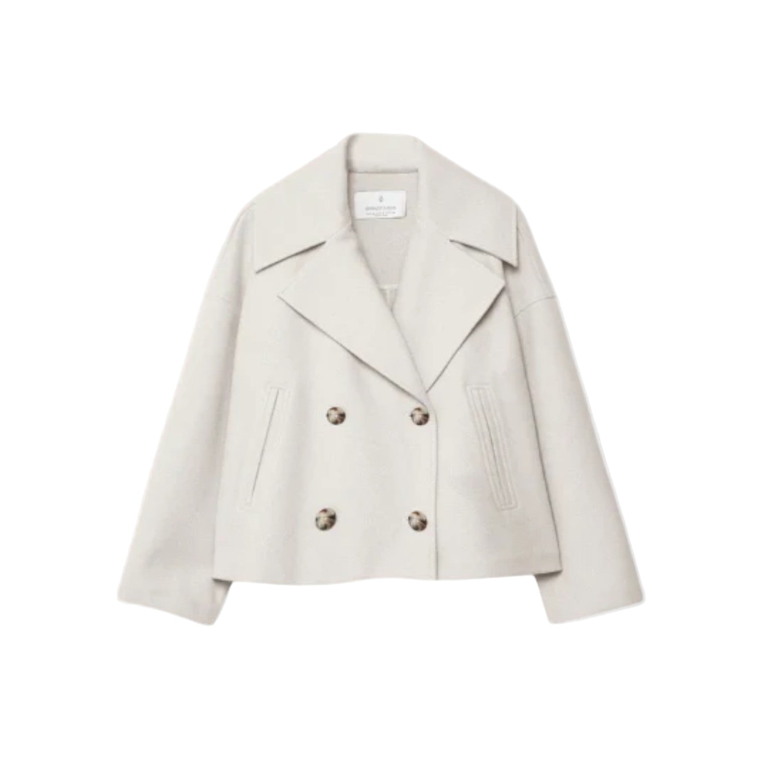 This women’s jacket has two rows of round buttons on the front, wide notched lapels, and long sleeves. Two vertical welt pockets are on the front, and the hem is straight.