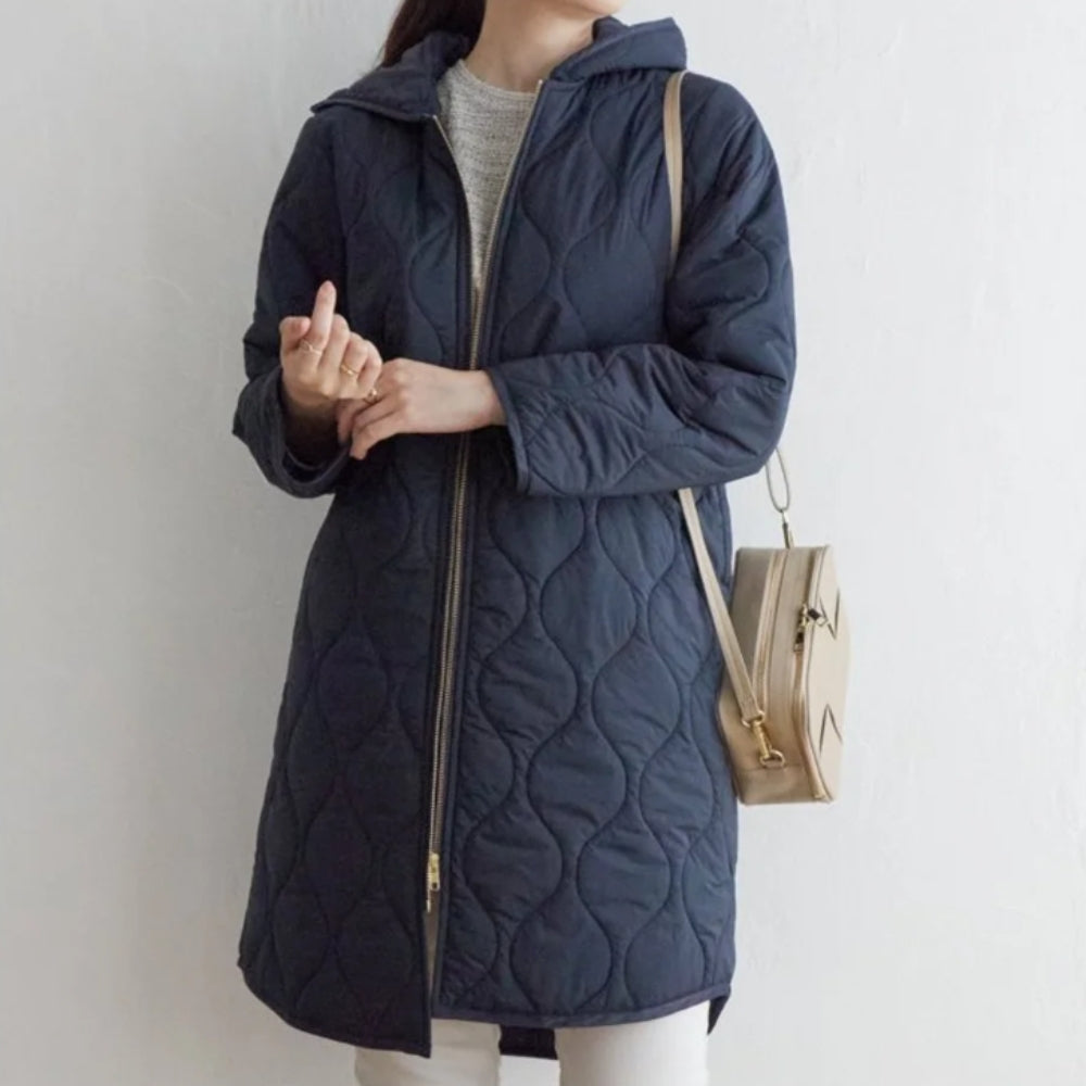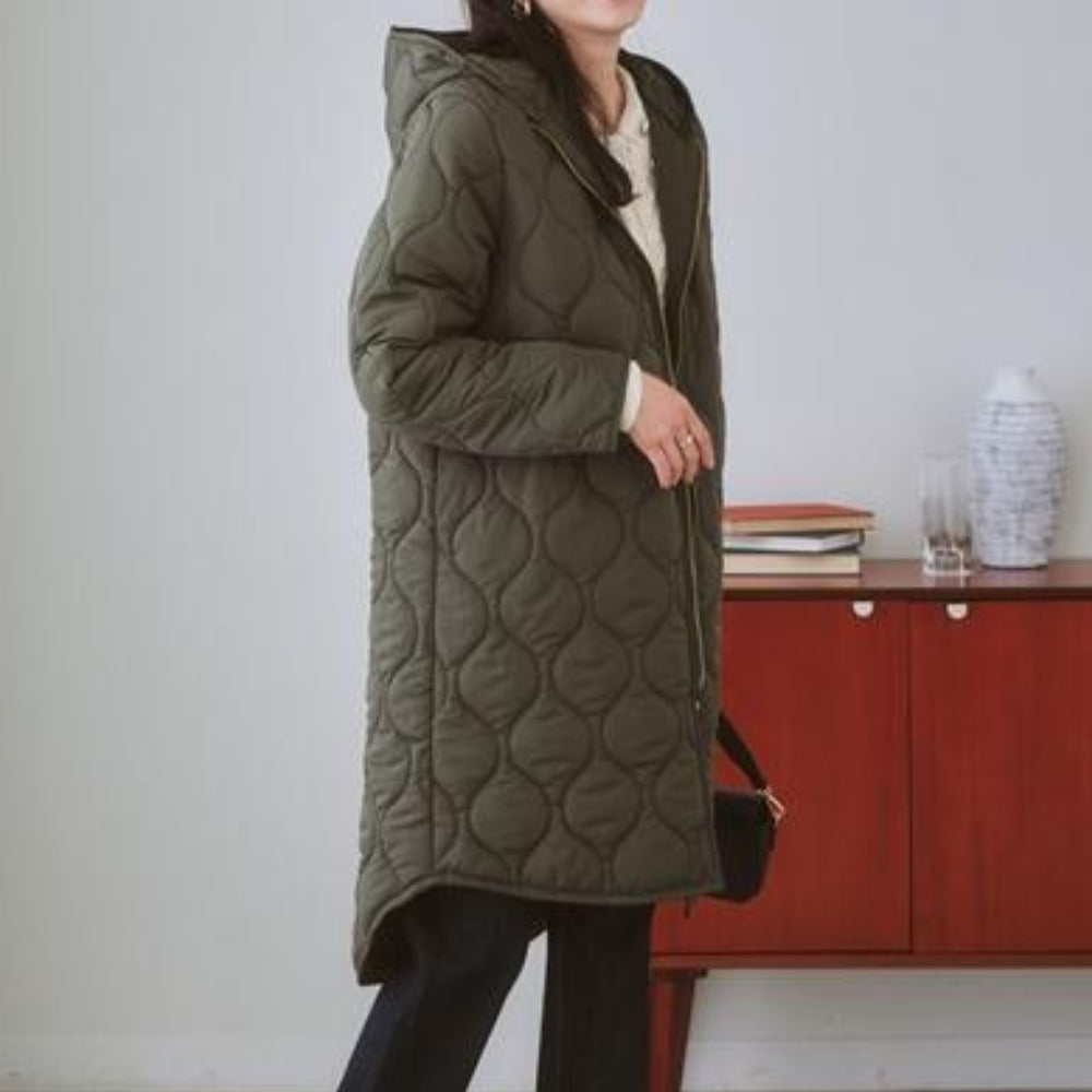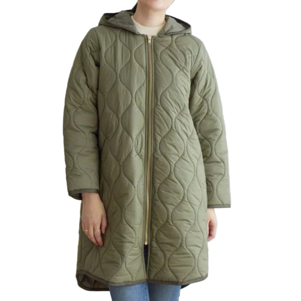 This woman's coat features long sleeves and a full-length zipper closure at the center front. The outer surface is quilted with a vertically arranged oval pattern. A hood is attached at the neckline.