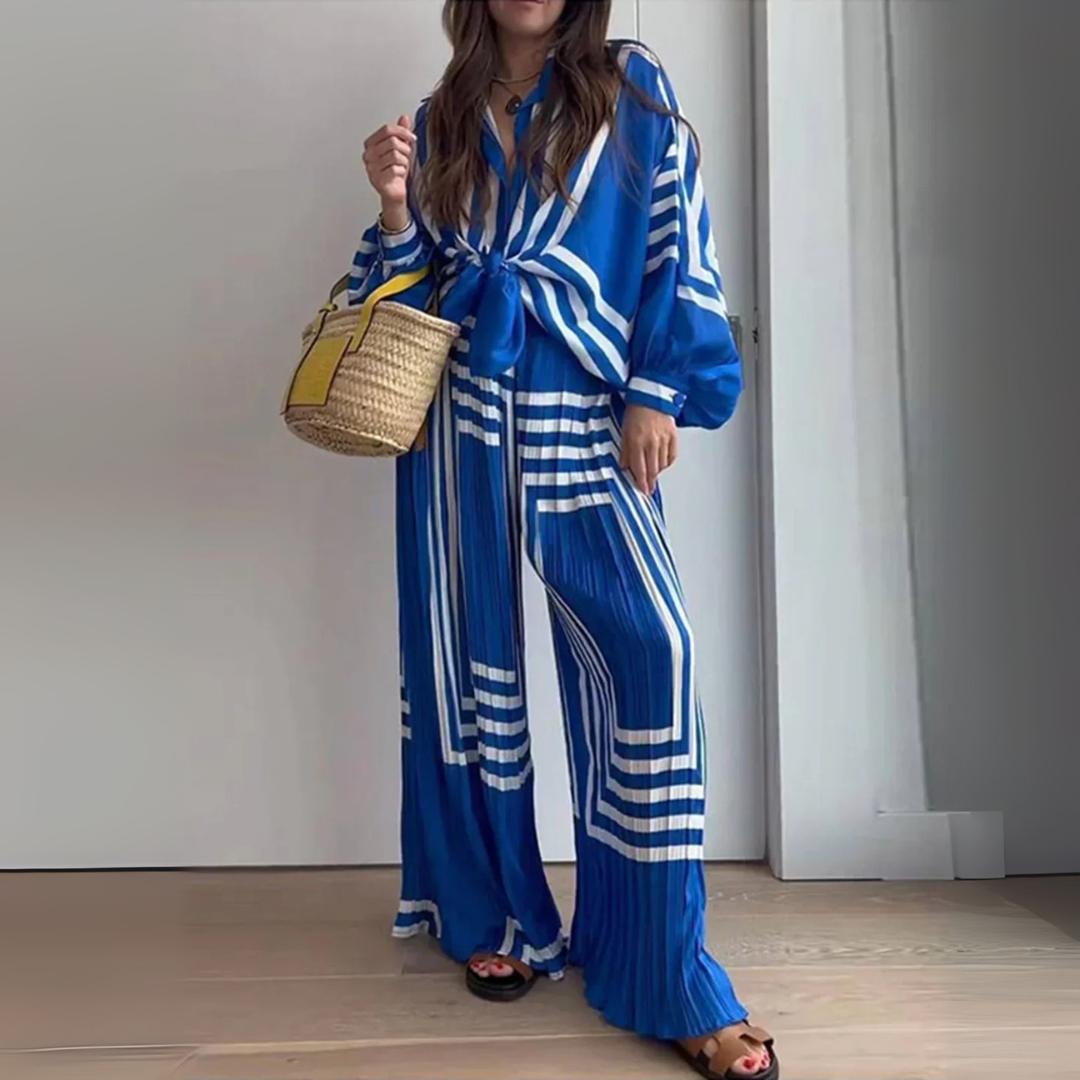 Women’s Set with Long Sleeves Tie-Front Blouse and Geometric Pattern