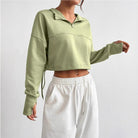 This women’s sweater has a stand collar with a front half-zip. A horizontal seam runs across the chest, and the sleeves have dropped shoulders. The hem has a drawcord with side ties, and the long sleeves have ribbed cuffs with thumbhole openings.