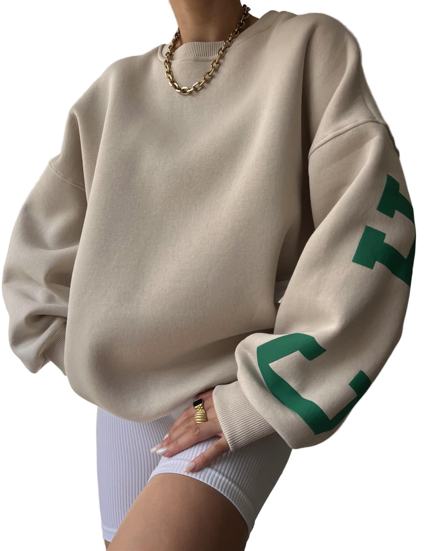 This woman’s sweater has a ribbed crew neck and a front without closures. It has dropped shoulders and long sleeves with wide ribbed cuffs. Both sleeves have block letter prints, and the hem is a straight ribbed hem.